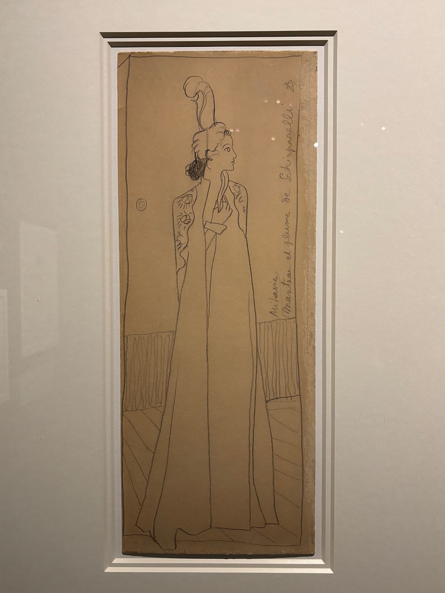 I am happy to report that the grotesque travel day and early wake-up was well worth it. The exhibition is breath taking, balancing Elsa Schiaparelli’s most groundbreaking designs with Daniel Roseberry’s modern showstoppers. Of course, the highlights for me were the iconic Cocteau collaboration coats, as well as the inclusion of a drawing of Schiaparelli by Cocteau that came from the Wunderman collection.
